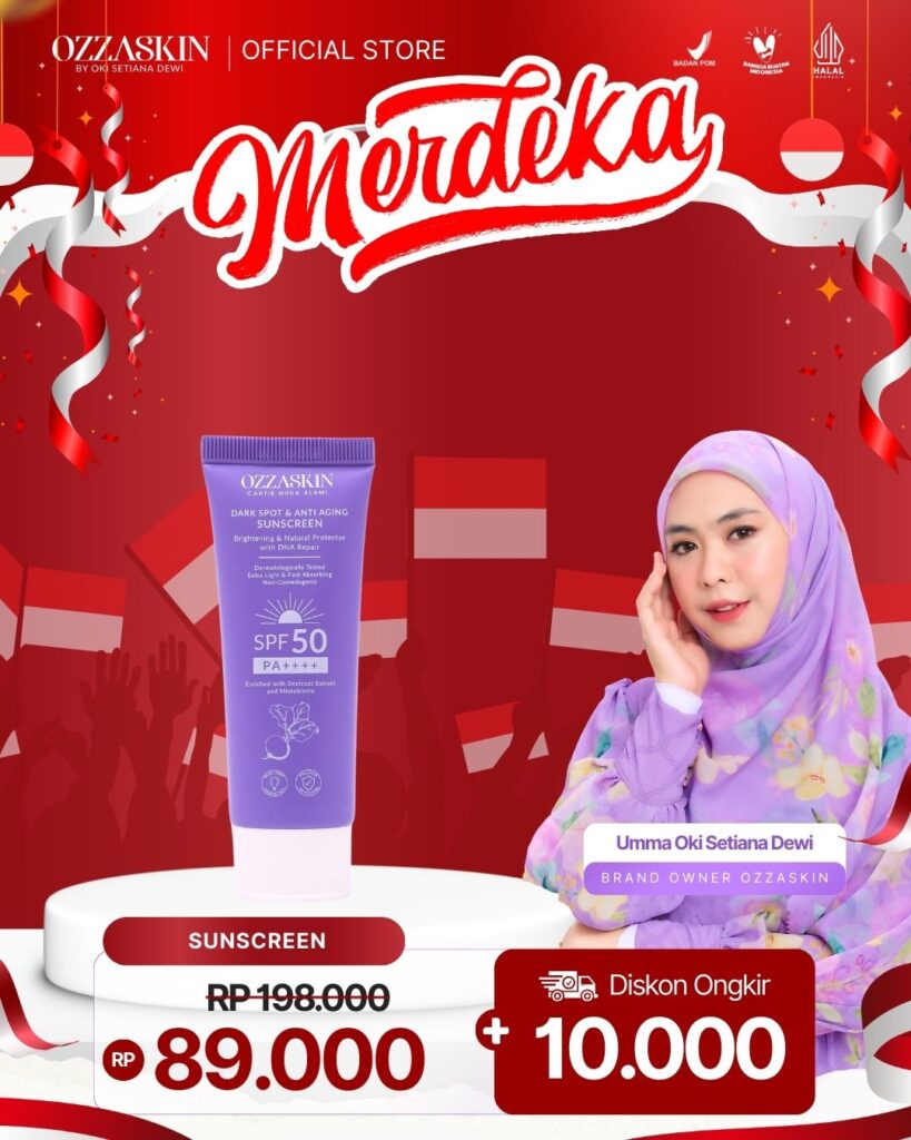 Dark Spot Anti Aging Sunscreen by OZZASKIN hadir dengan tekstur yang lembut. Melindungi kulit wajah dari paparan sinar matahari, blue light dan radikal bebas dengan natural protector with DNA repair sehingga membuat kulit wajah terlindungi dan cerah alami dari dalam.