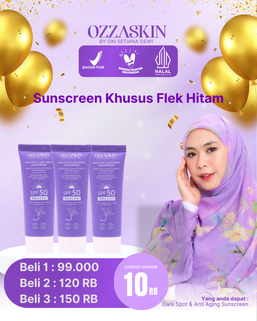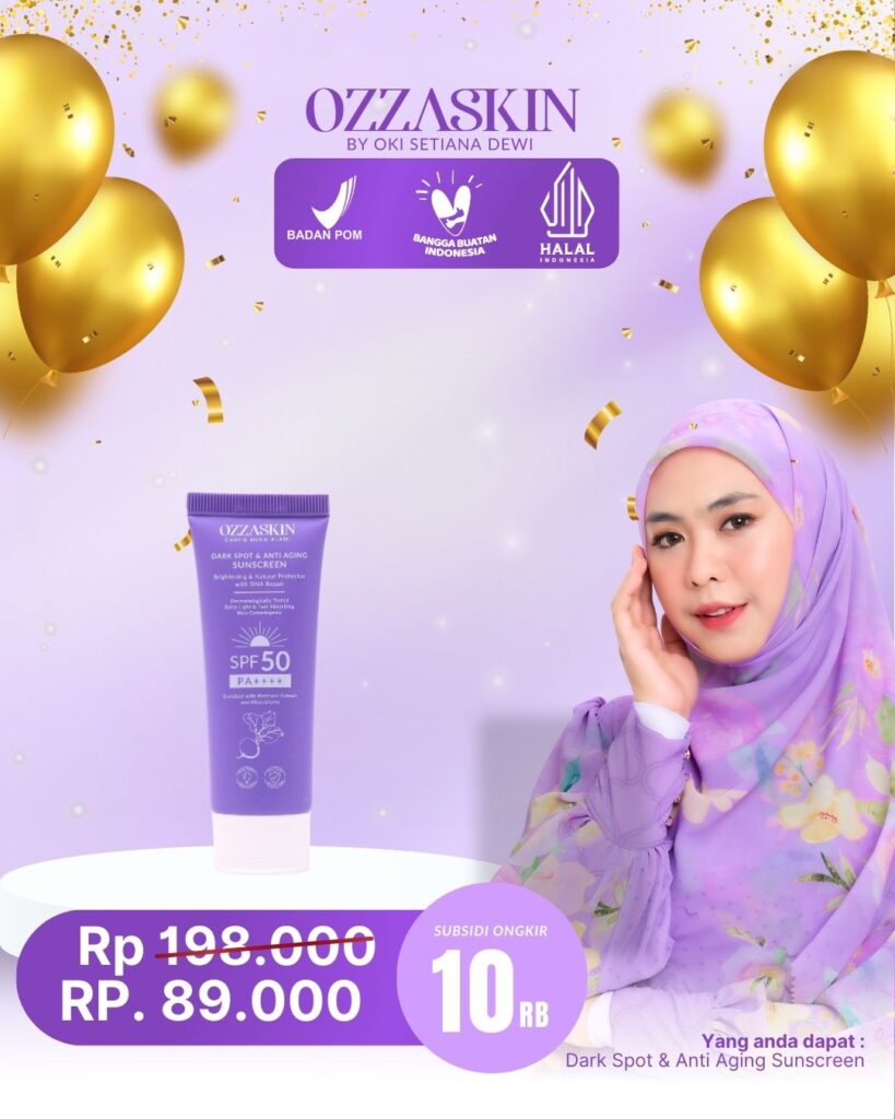 Dark Spot Anti Aging Sunscreen by OZZASKIN hadir dengan tekstur yang lembut. Melindungi kulit wajah dari paparan sinar matahari, blue light dan radikal bebas dengan natural protector with DNA repair sehingga membuat kulit wajah terlindungi dan cerah alami dari dalam.